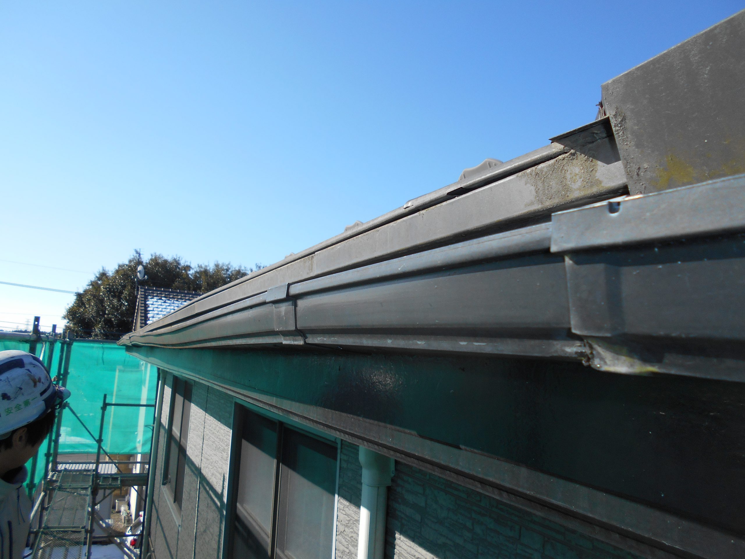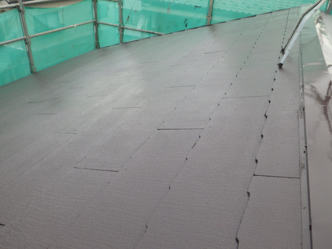 スレート屋根材同士の隙間に差し込み、スレート屋根材の上部に引っ掛けて固定していきます。 固定部が見えませんので、引っ掛けたらゴムハンマーで叩き確認しながら取り付けました。 最後に取り付け時、塗料が剥がれた所をタッチアップして終了です。