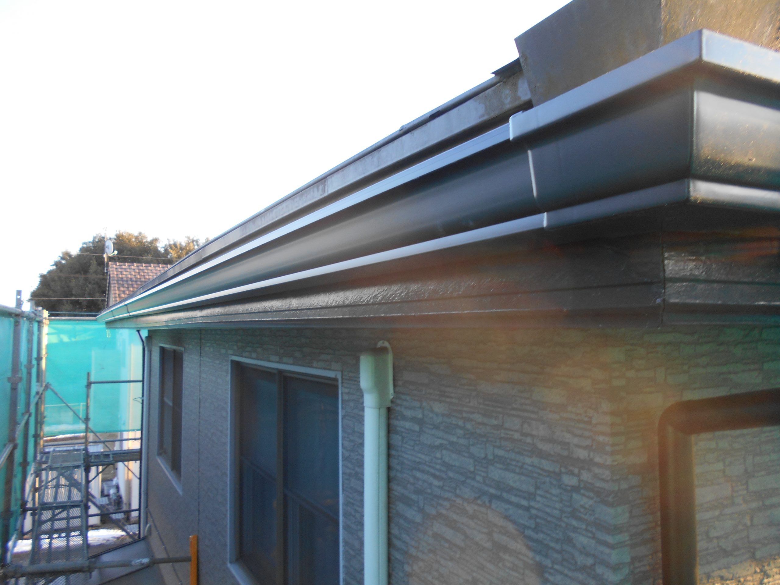 谷樋から軒樋に勢いよく雨水が流れ込みますのでしぶきが飛びます。 飛散を防止するためにカバーを取り付けました。 全ての工程が終了しました。 これで何時雪や雨が降っても安心です。
