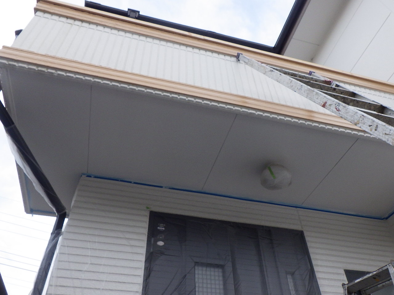 小山市でスレート屋根と窯業系外壁塗装工事が完工しました 本日の施工前の状態です 昨日 外壁の上塗りが終了して 補修作業と下屋根の上塗りが残っている状態です 外壁の見切り補修中です 見切り線が曲がっていたり塗料の染み込みがある場所など もう一度マスキングテープを真っすぐ貼り付け塗料…