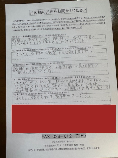 - 雨漏りの不安をしっかり解消して、安心して長く住めるようにしてほしいと思っていました。